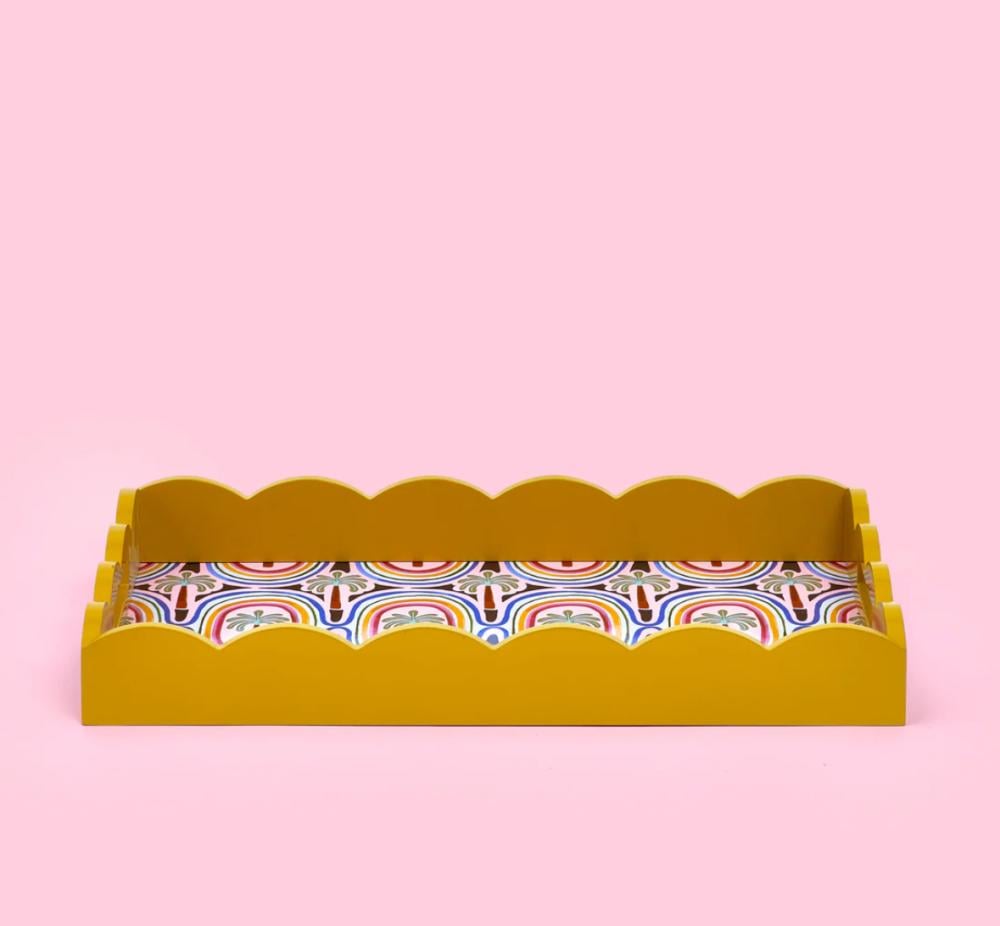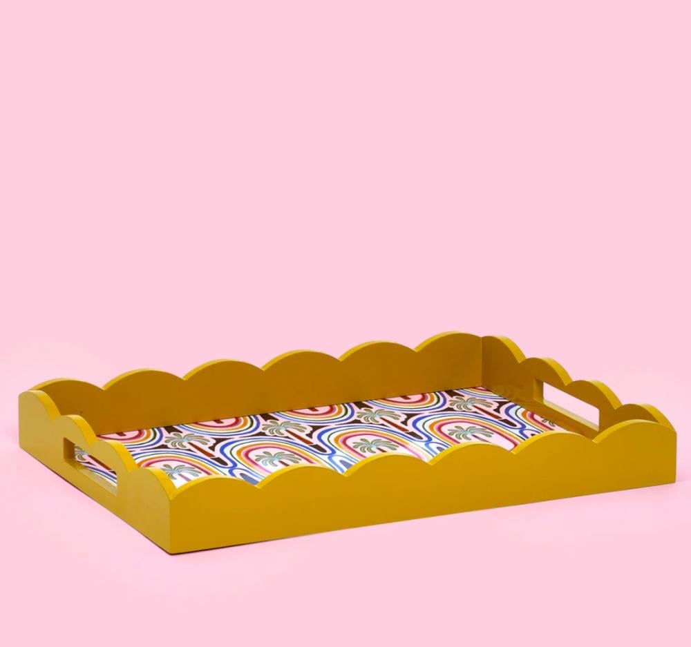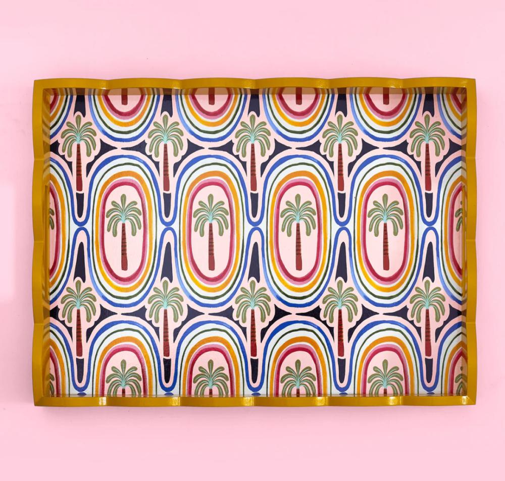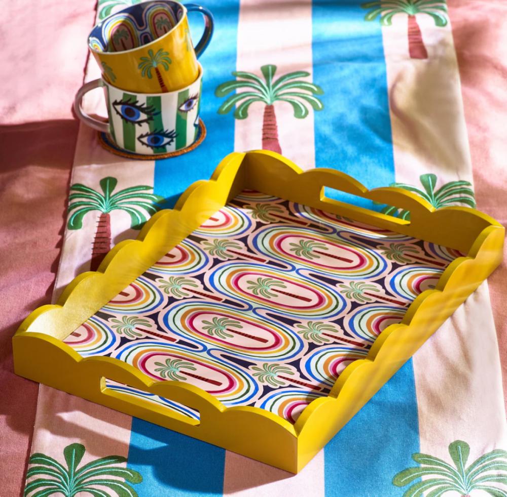 أضف لمسةً من الألوان إلى مطبخك مع صينية نخيل نابضة بالحياة من مجموعة إلكتريك كوست. مزينة برسومات استوائية وحافة صدفية جريئة، مثالية للتقديم أو التزيين. سطحها المتين سهل التنظيف يجعل الاستخدام اليومي سهلاً للغاية.